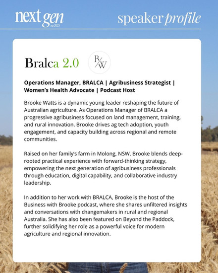 In addition to her work with BRALCA, Brooke is the host of the Business with Brooke podcast, where she shares unfiltered insights and conversations with changemakers in rural and regional Australia. She has also been featured on Beyond the Paddock, further solidifying her role as a powerful voice for modern agriculture and regional innovation.